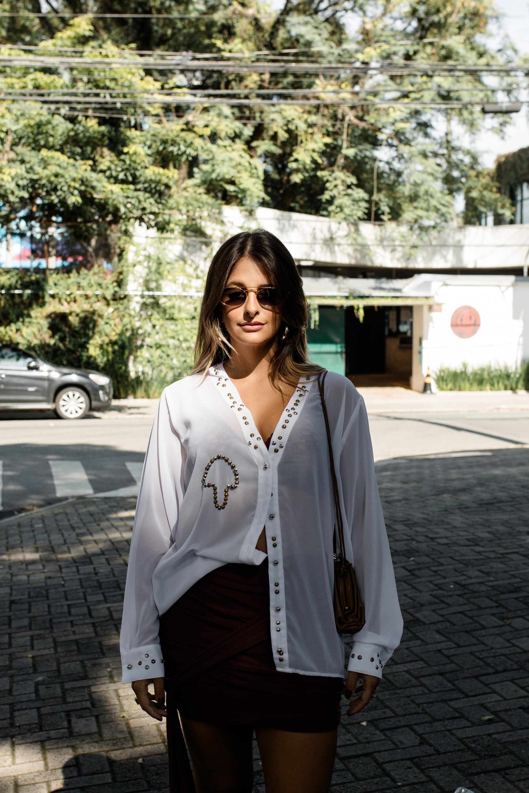 Camisa Mush: construída em musseline, possui corte mais amplo, mangas longas, e golas e punhos entretelados. Detalhe para os bordados na parte da frente da camisa, taxas de tamanhos, texturas e cores diferentes bordadas em todo comprimento a mão por nossas artesãs. Além disso, na parte da frente foi desenhado um pequeno cogumelo (“mush”) que faz referência a coleção atual.